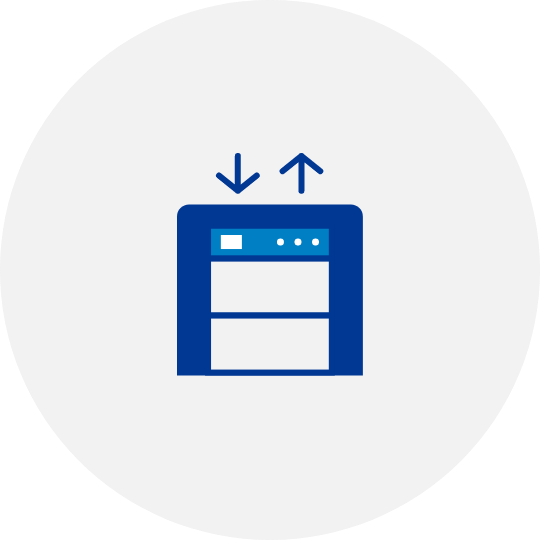 カメラ&タッチパネル付きディスプレイを搭載した小荷物専用昇降機です。荷物の垂直運搬だけではなく、「他階が見える」をプラスしたワンフロア感覚のオペレーションを提供できます。