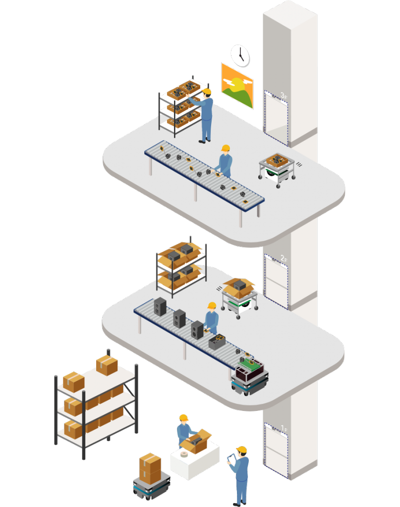 製造ラインが各フロアに分散している生産現場でも、AMRが昇降機連携していればフロア間の自動搬送が可能に。人手不足の解消&生産効率アップを実現できます。