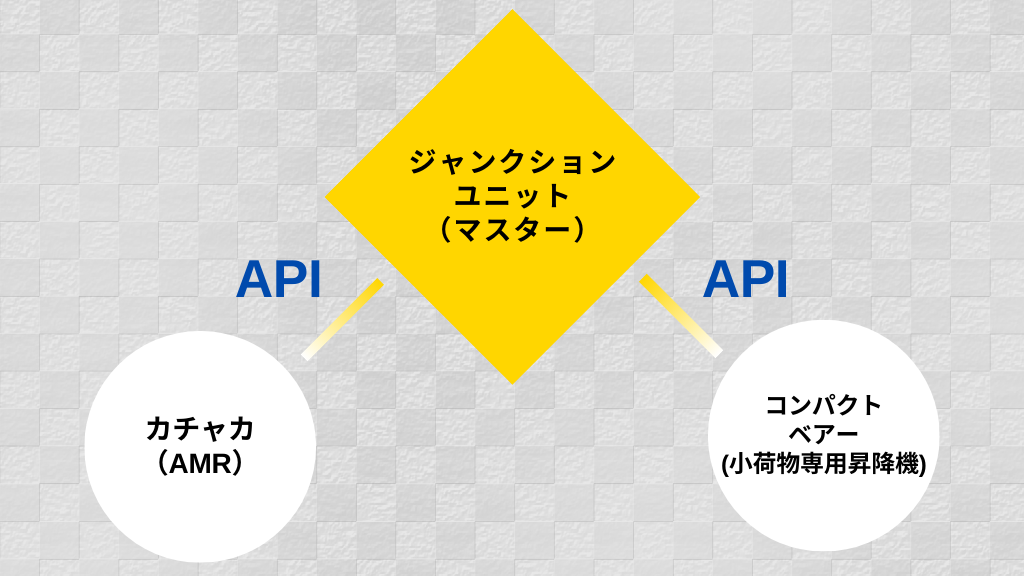 ジャンクションユニット(マスター)がカチャカをAPI通信で動かし、カチャカの状況を管理しながらコンパクトベアー(小荷物専用昇降機)にも指示を出しスムーズに連携させます。