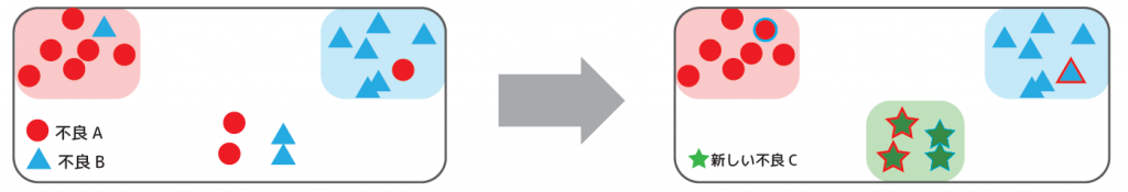誤分類が発生した場合、NG マップ上である不良種のNG 見本画像と別の不良種の検査対象画像が近くに