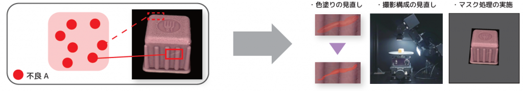 NG 見本画像の正確な塗り直し、光学系設計の見直し、該当過検出箇所のマスクを行うことで、