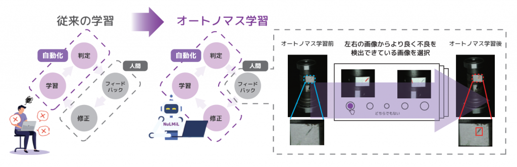 従来のAI 学習では、不良検出精度を上げるために専門のエンジニアが前処理時・AI 学習時のパラメータの修正を試行錯誤する必要がありました。一方、オートノマス学習では、自社製品の不良の特徴さえ把握していれば、専門知識がなくとも、誰でも簡単にこれらのパラメータを修正できます。具体的には、左右の画像で不良が検出できているか否かのAB テストによるフィードバックによって、AI 自身が自律的にこれらのパラメータを修正します。お客様からは、「現場の検査担当者でも、簡単操作で高精度に不良を検出できるようになった」というお声をいただいております。
