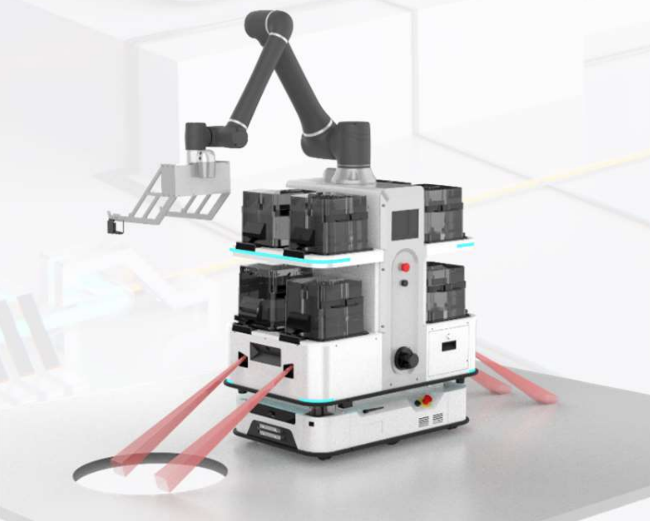 3Dビジョン検出センサーが2つあり安全シグナルが直接PLCへ接続し、“ハードウェアレベル”のリアルタイム応答を確保し、現場運行が一層安全確保できる。ロボットが走行中に前方レーダ掃射面以下に異物が発生した場合、レーダ掃射面以下の異物にロボットが衝突しないように適時に検出し、停止することを実現する。