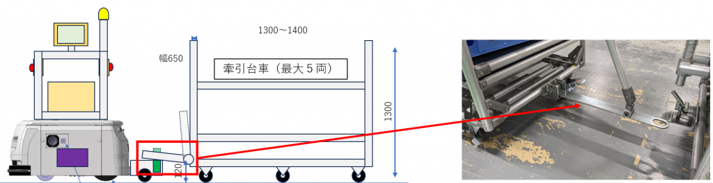 - 台車サイズ:幅650mm×長さ1300mm×高さ1300mmを牽引したい。